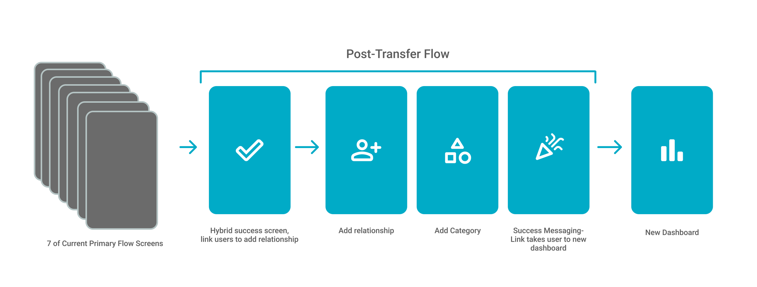 Due to timelines and resources, we were not allowed to change our primary transfer flow (see Current Mobile App Flow below). Instead, everything that the users would have to engage with would be after they have sent their transfer. Since entering this information was optional, we wanted to find a way to encourage users to tag this information easily so we could reflect this information back to them in a meaningful way.